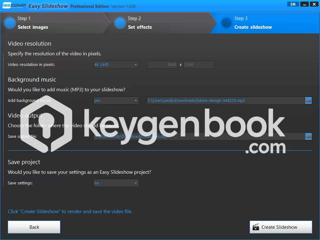 You can export your slideshow in MPEG or MP4 format in Full HD, 4K, or your own resolution. The Premium tools version also does not include a watermark, which is perfect for professional slideshows.