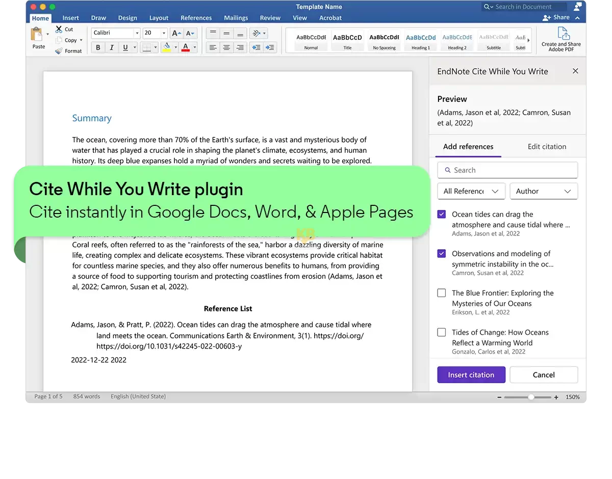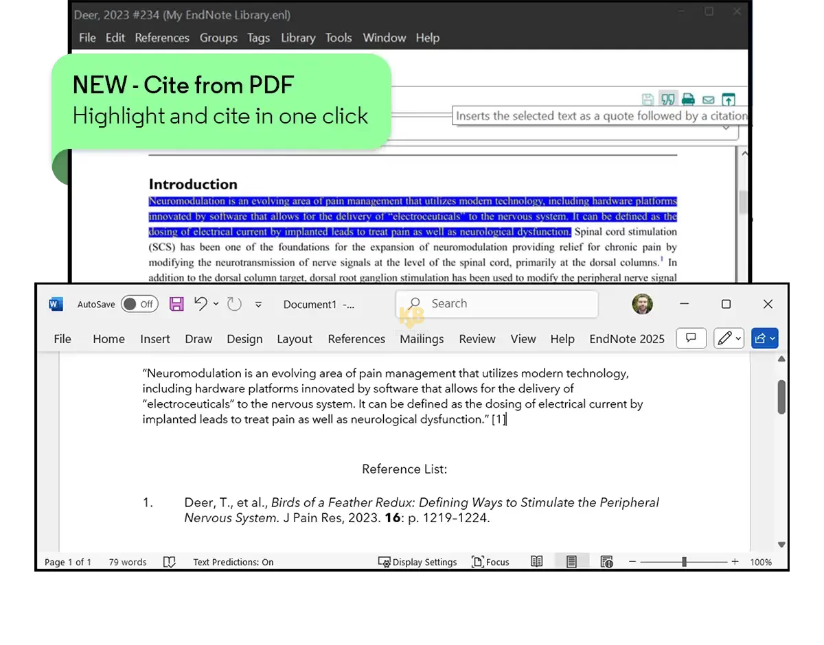EndNote integrates with Microsoft Word to help you cite while you write. The new Cite While You Write™ toolbar is faster and more intuitive in EndNote 2025. -